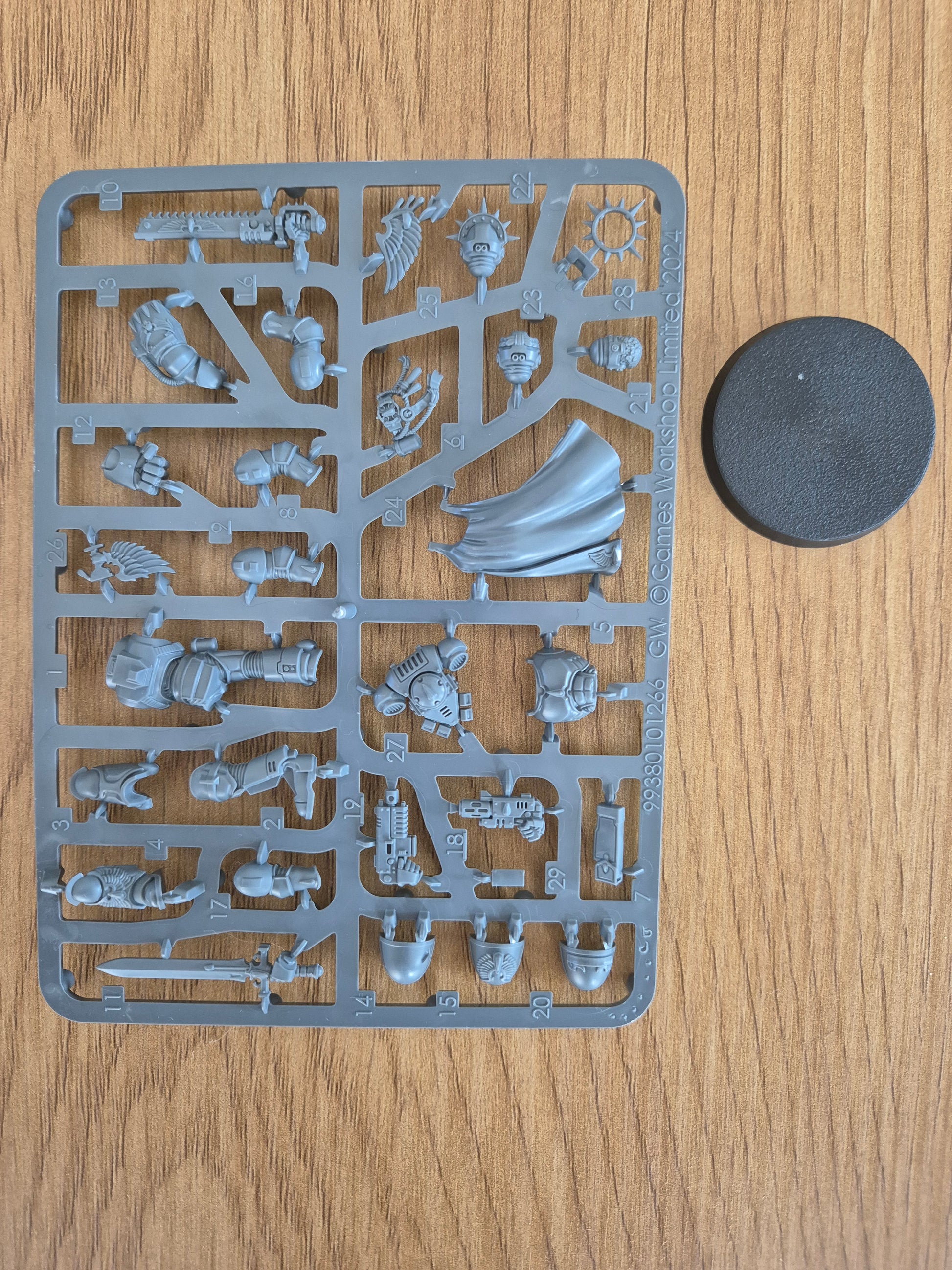 Der Gussrahmen des Captains ist der Standart Multipart Rahmen von Games Workshop mit verschiedenen Baumöglichkeiten des Captains. Verschiedene Ausrüstung, verschiedene Varianten der Köpfe usw. Die Base ist dabei.