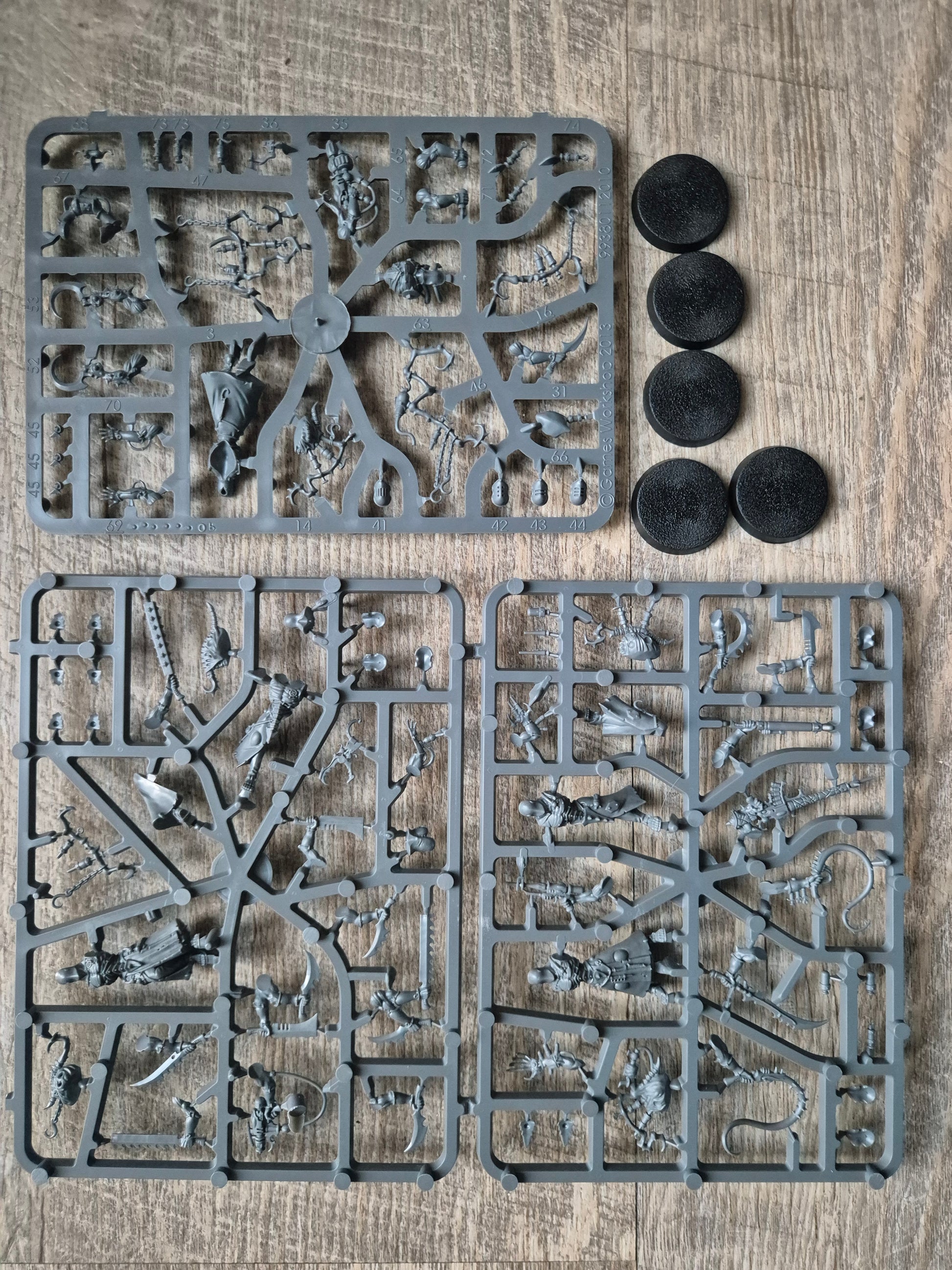 Die Gussrahmen der Folterer sind die Standard Multipart Rahmen von Games Workshop. Die Bases sind dabei. Aus diesem Set können 5 Modelle gebaut werden
