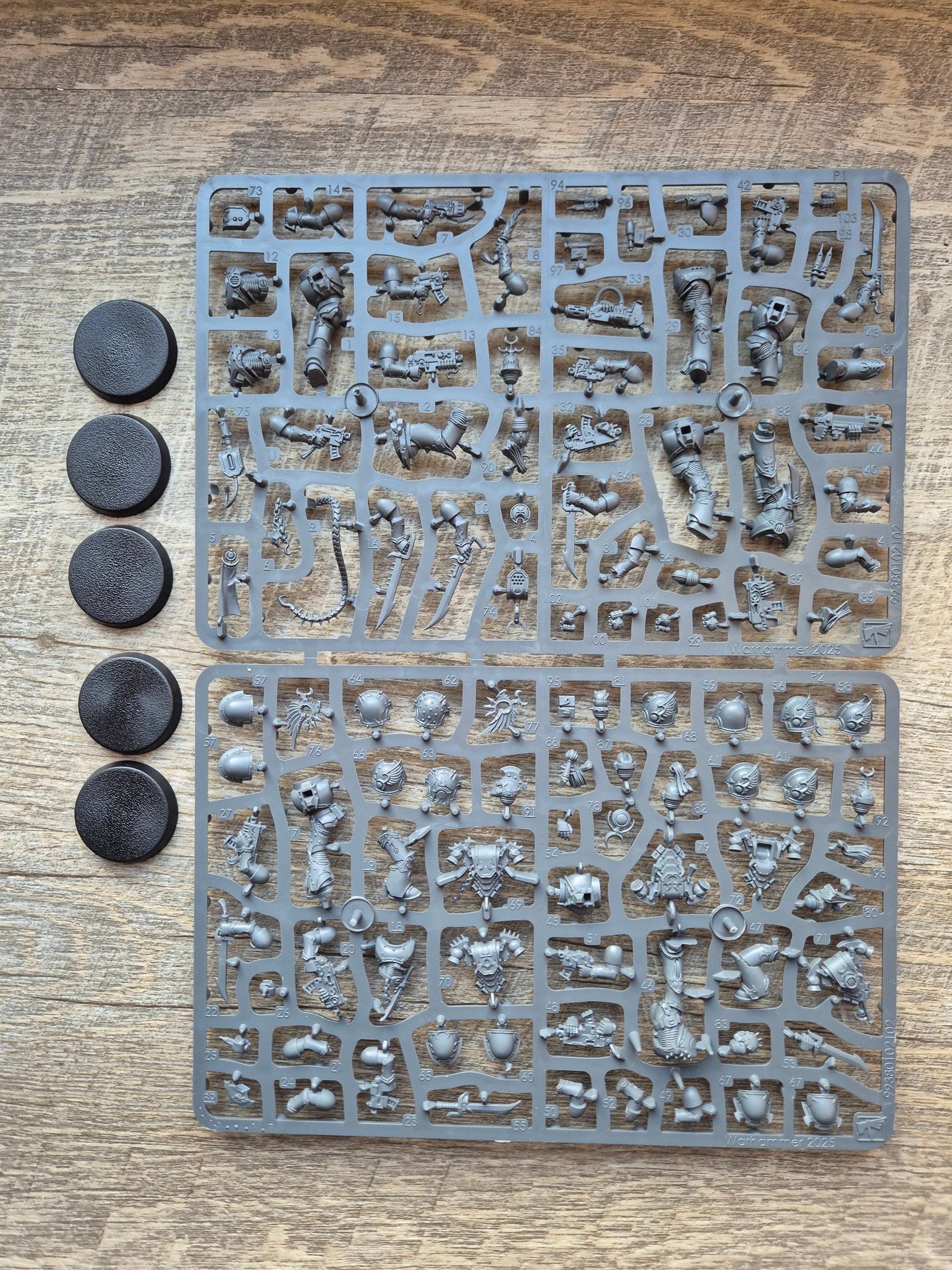 Der Gussrahmen der Tormentors / Infractors sind die Standard Multipart Rahmen von Games Workshop mit verschiedenen Baumöglichkeiten des Marines. Verschiedene Ausrüstung, verschiedene Varianten der Köpfe usw. Die Bases sind dabei.