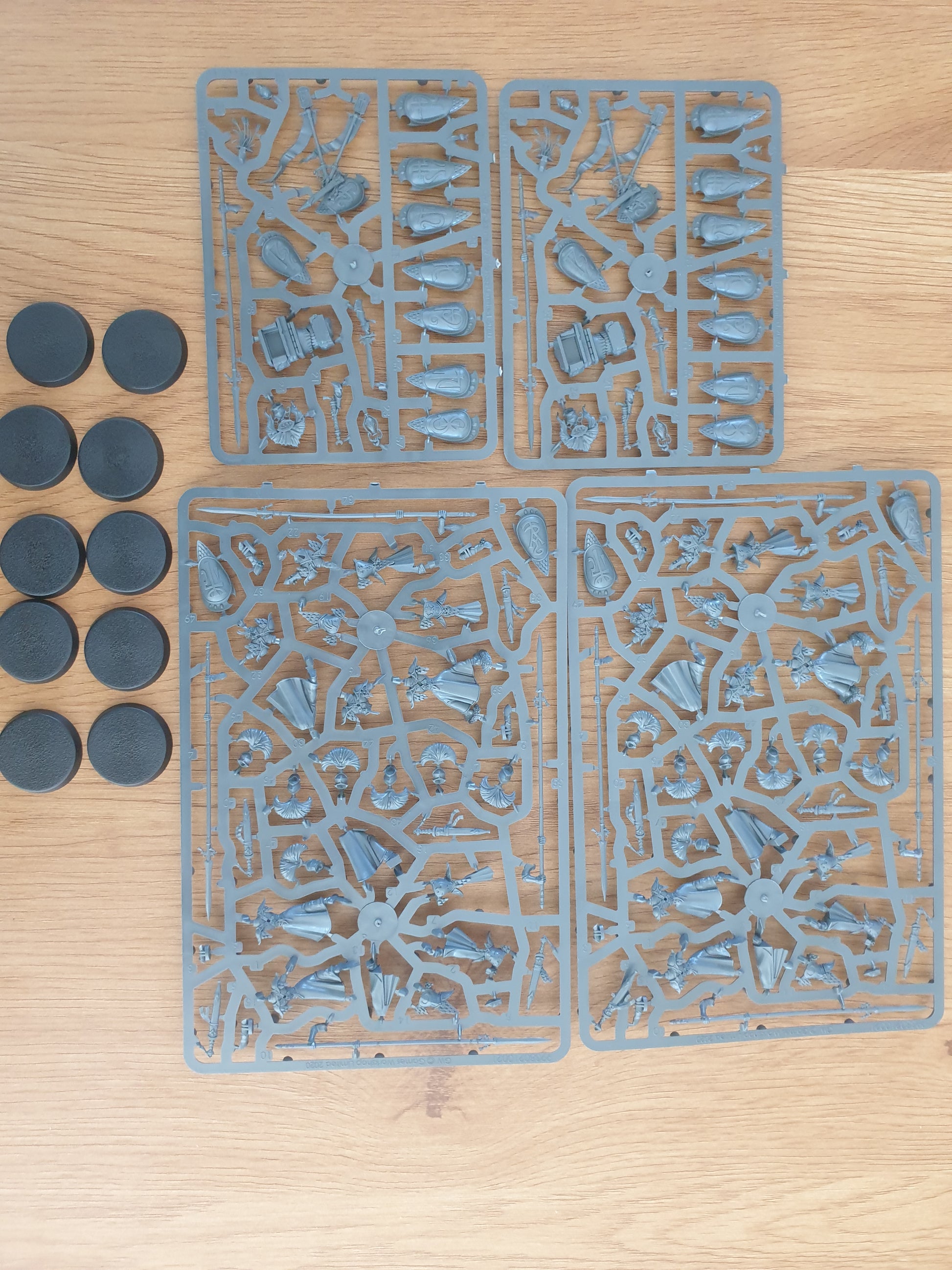 Die Gussrahmen der Auralanwächter sind die Standard Multipart Rahmen von Games Workshop mit verschiedenen Baumöglichkeiten. Verschiedene Ausrüstung, verschiedene Varianten der Köpfe usw. Die Bases sind dabei. Aus diesem Set können 10 Modelle gebaut werden
