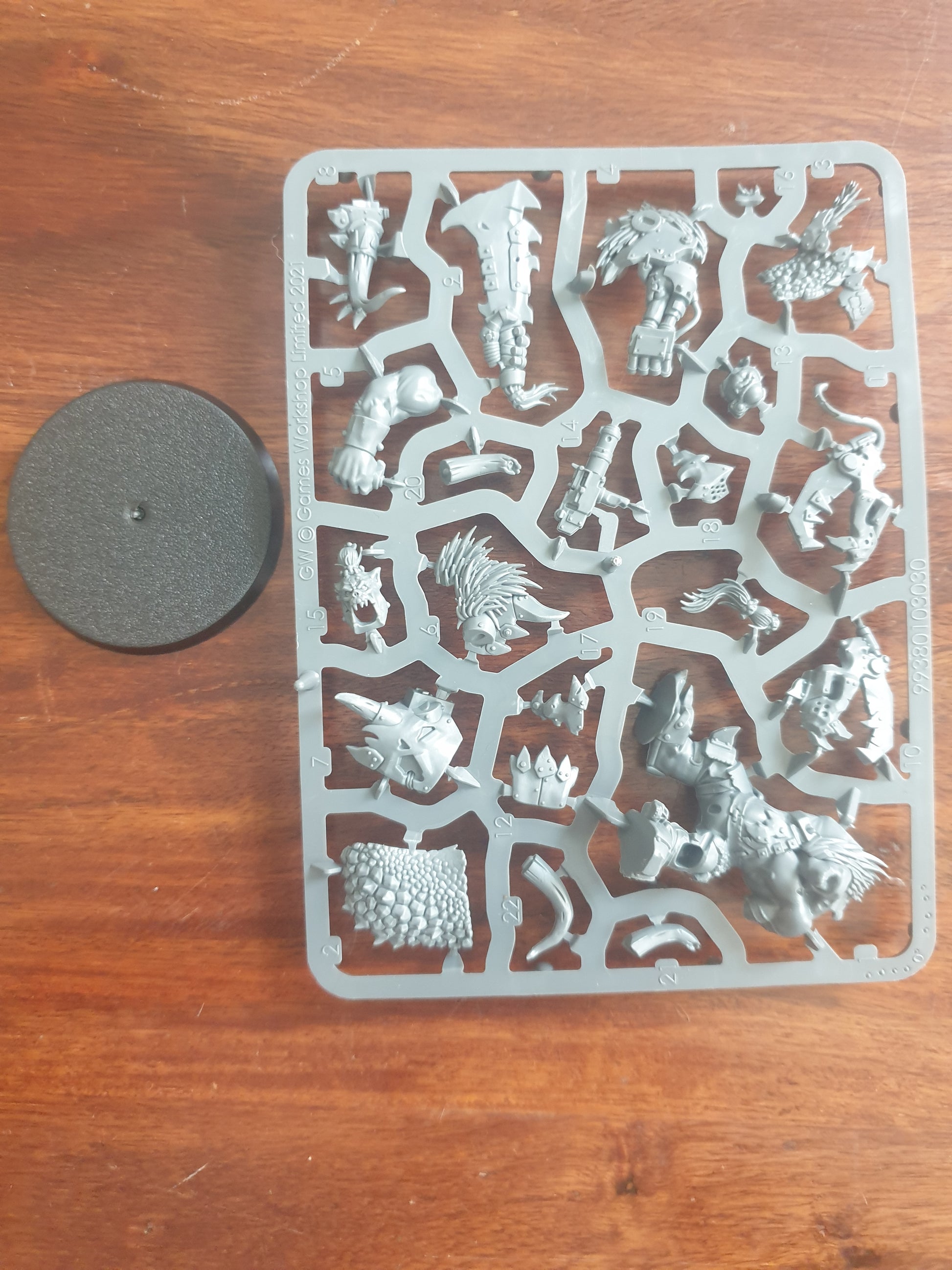 Der Gussrahmen des Viechboss ist der Standard Multipart Rahmen von Games Workshop. Die Base ist dabei.