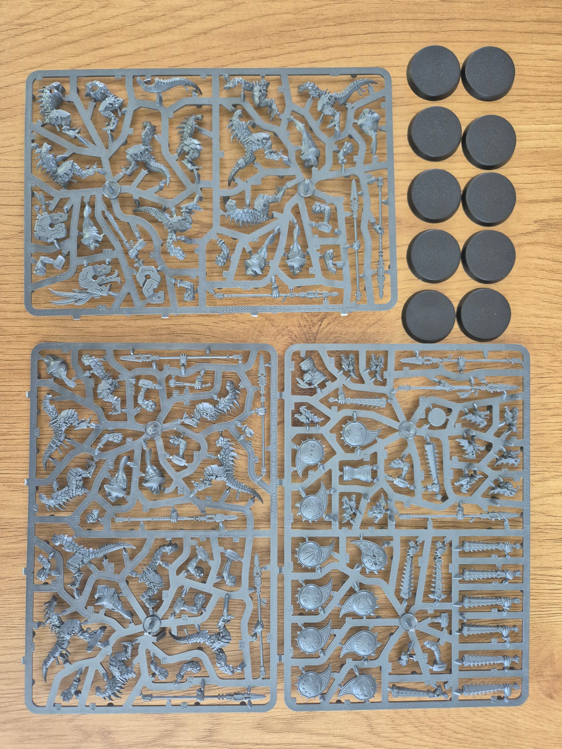 Die Gussrahmen der Saurus Krieger sind die Standard Rahmen von Games Workshop. Die Bases sind dabei.