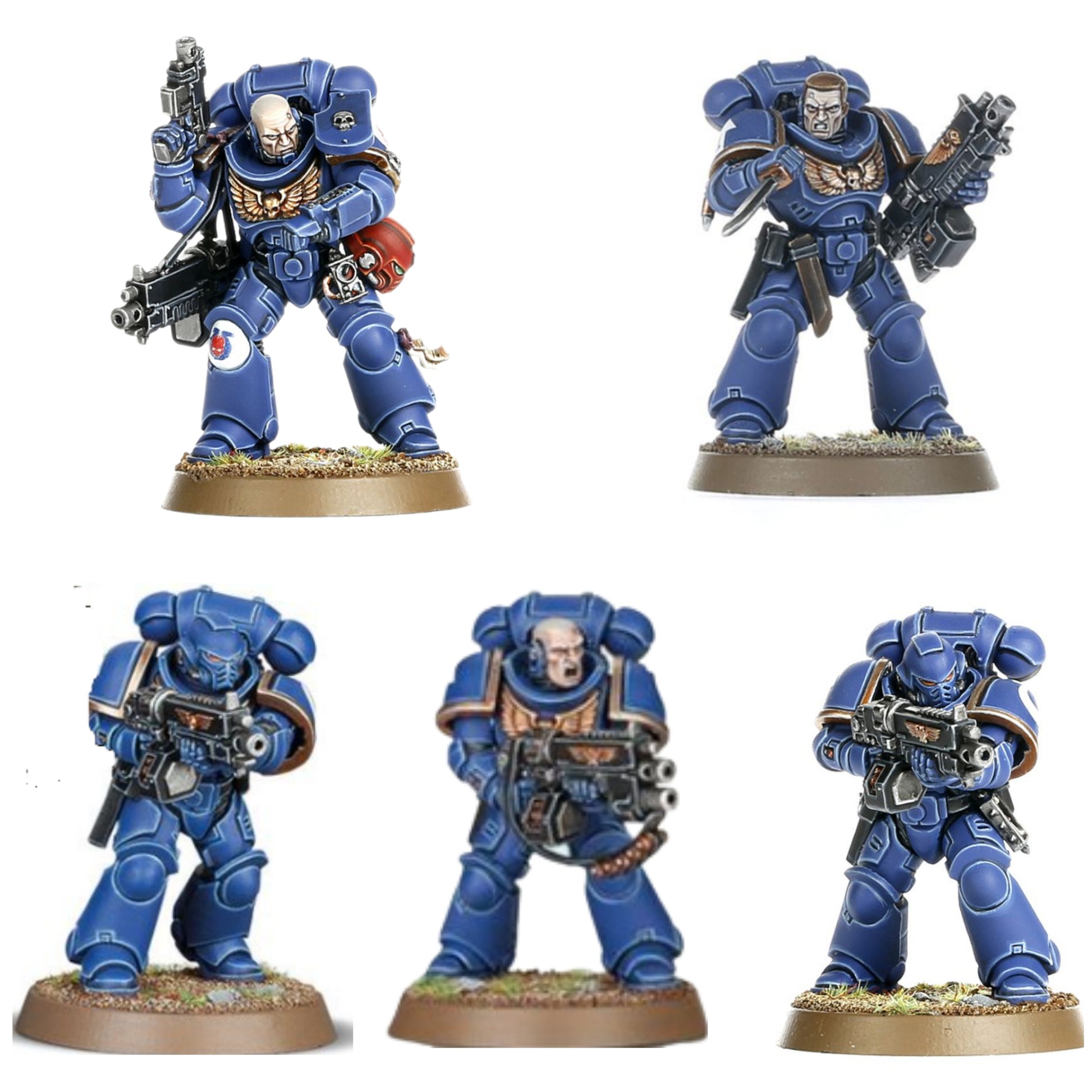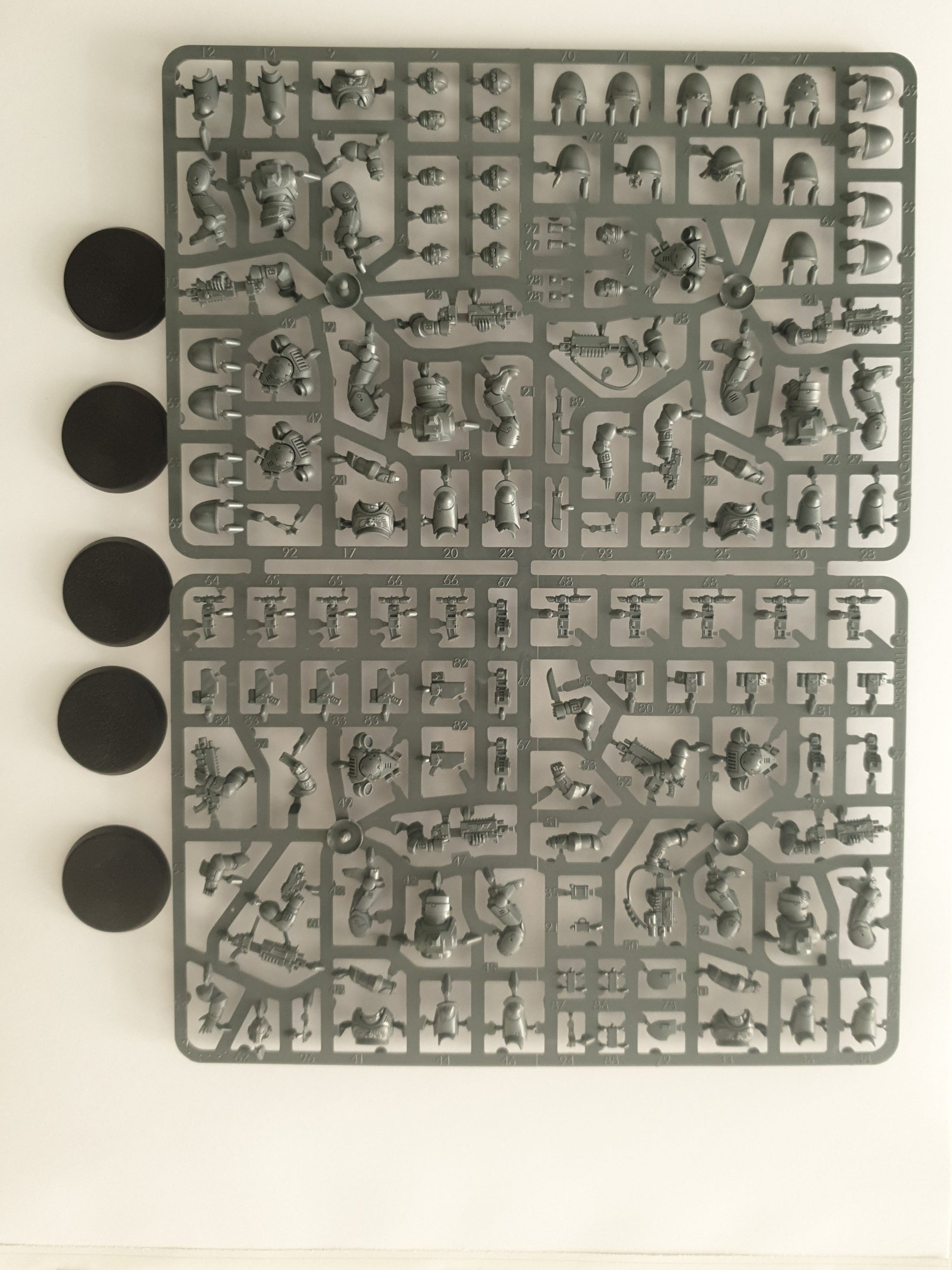 Die Gussrahmen der Intercessoren sind die Standard Multipart Rahmen von Games Workshop mit verschiedenen Baumöglichkeiten. Verschiedene Ausrüstung, verschiedene Varianten der Köpfe usw. Die Bases sind dabei. Aus diesem Set können 5 Modelle gebaut werden