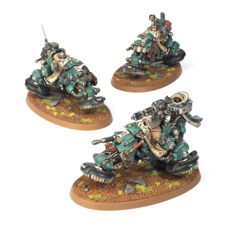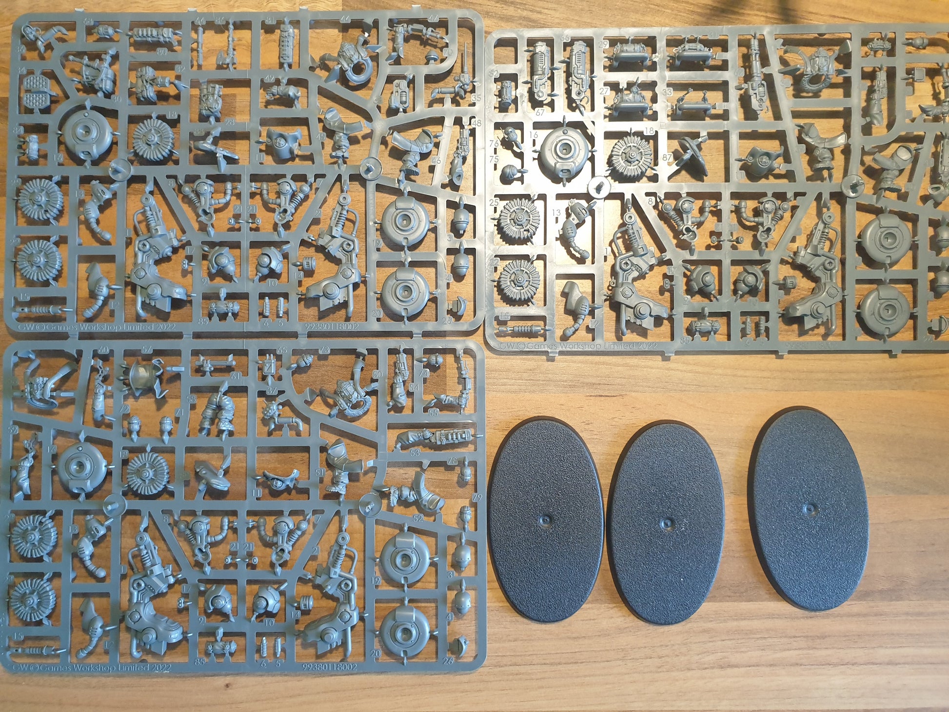 Die Gussrahmen der Pioniere sind die Standard Multipart Rahmen von Games Workshop mit verschiedenen Baumöglichkeiten der Marines. Verschiedene Ausrüstung, verschiedene Varianten der Köpfe usw. Aus dem Rahmen können 3 Modelle gebaut werden. Die Bases sind dabei.